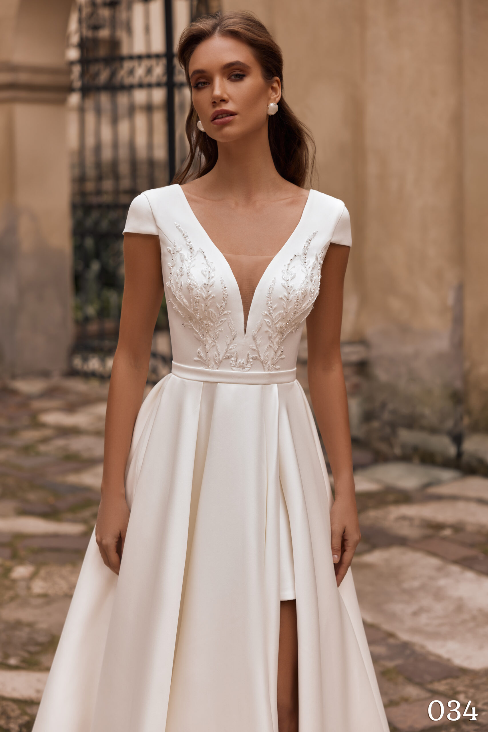 Modelul 034 este o rochie A-line sofisticată, cu pliuri voluminoase, ce oferă o alură prințesă rafinată. Realizată din atlas luxos, această rochie impresionează prin slitul elegant, care dezvăluie discret o fustiță scurtă. Corsetul este decorat cu dantelă cusută manual, mărgele și perle, iar braul detașabil evidențiază armonios talia.