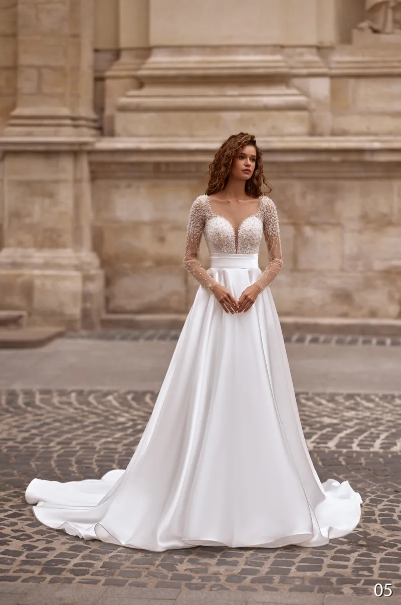 Această rochie tip prințesă are o fustă amplă din material satinat, cu un cădere elegantă. Corsetul semitransparent decorat cu perle și mânecile fine din tulle îi oferă un aer delicat, iar spatele decupat adaugă o notă rafinată întregii ținute.