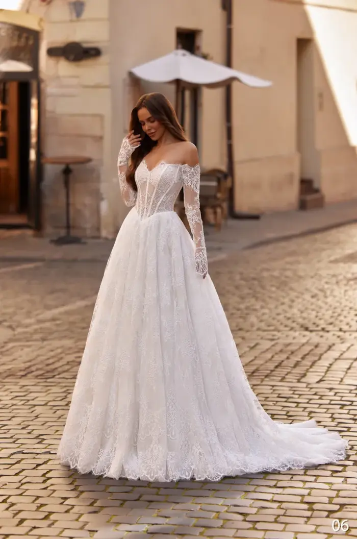 Această rochie tip prințesă, confecționată din dantelă fină, are o fustă amplă și o trenă elegantă. Corsetul cu umeri căzuți și mâneci din dantelă îi oferă un aer romantic, iar detaliile delicate pun în valoare silueta într-un mod clasic și rafinat.