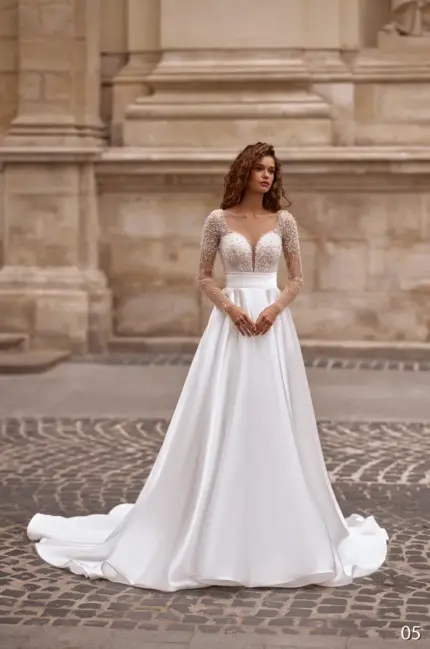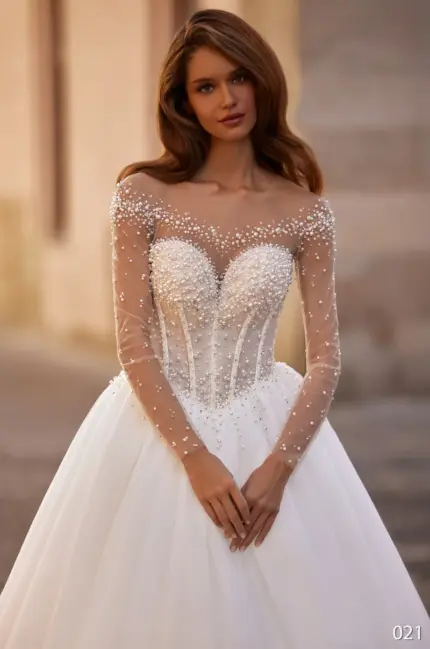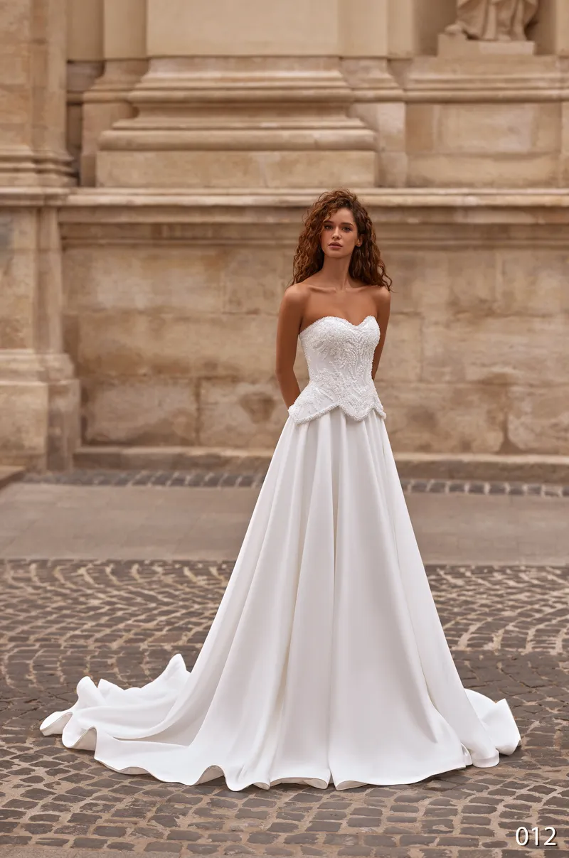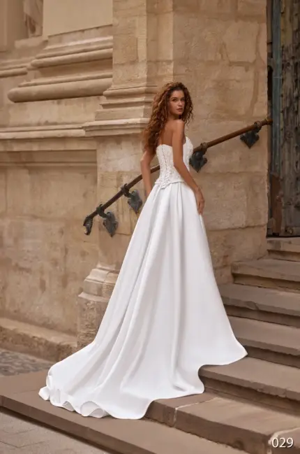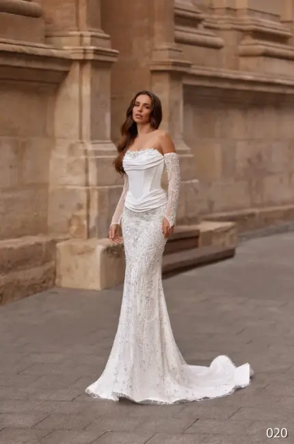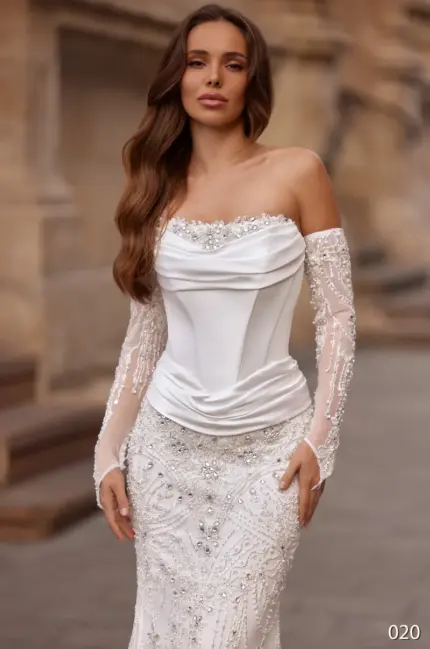 Această rochie de mireasă tip sirenă îmbină un corset cu decolteu sweetheart și aplicații rafinate, cu o siluetă elegantă ce evidențiază linia corpului. Trena detașabilă adaugă un plus de dramatism și versatilitate, transformând cu ușurință ținuta într-una spectaculoasă.