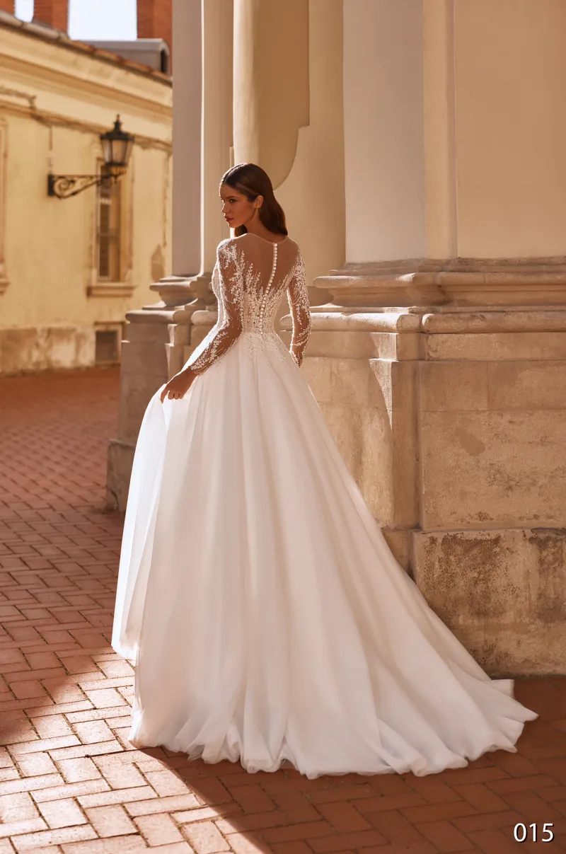 Această rochie de mireasă tip A-line impresionează prin corsetul iluzie cu mâneci lungi din tulle brodat și aplicații florale delicate. Fusta amplă din tulle cade lejer, creând o siluetă elegantă și plină de rafinament.