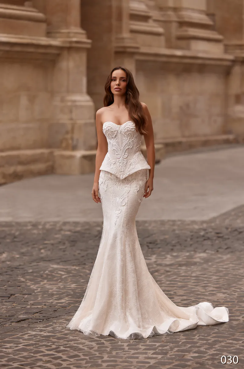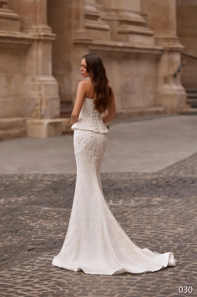 Această rochie tip sirenă se remarcă prin corsetul decorat cu broderii sculpturale și talia conturată elegant. Fusta mulată din dantelă subliniază linia corpului și se continuă într-o trenă delicată, pentru un look rafinat și feminin.