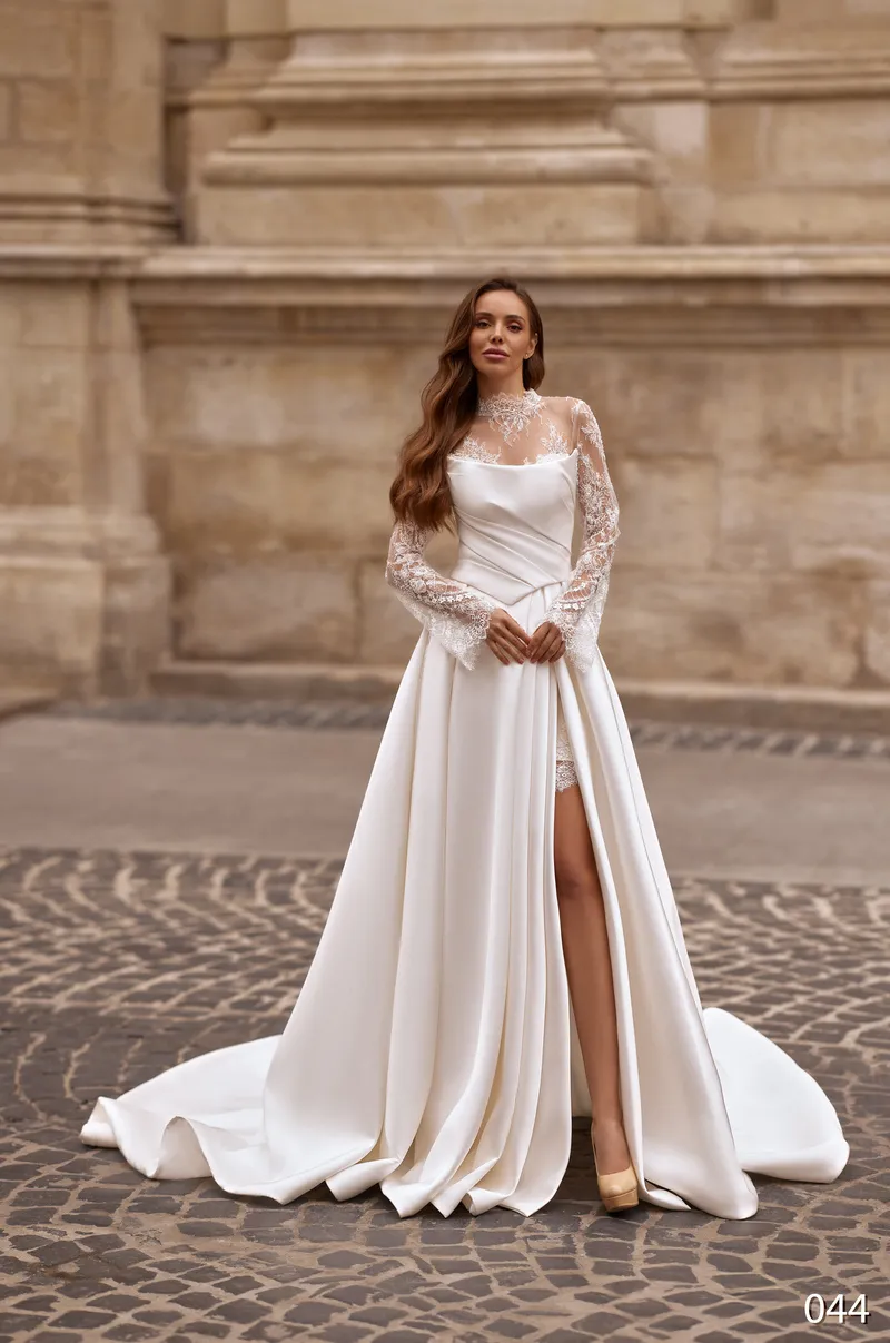 Această rochie prințesă combină satinul sofisticat cu un bolero delicat din dantelă, cu guler înalt și mâneci elegante. Fusta amplă cu șliț se poate detașa, transformând ținuta într-o rochie scurtă modernă din dantelă. Un model versatil și rafinat, ideal pentru o apariție memorabilă.