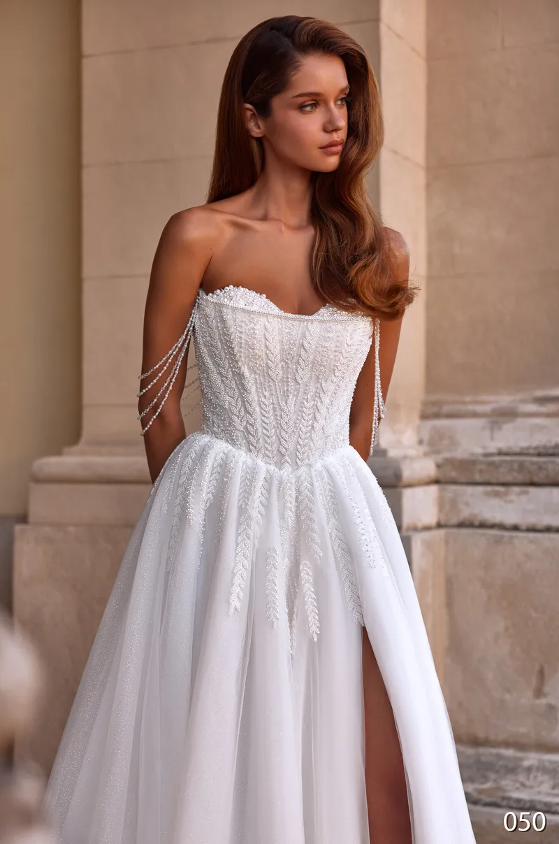 Această rochie A-line se remarcă prin corsetul decorat cu broderii verticale ce conturează delicat silueta. Fusta lejeră din tulle, cu șliț înalt, este pusă în valoare de accesoriile tip lanț perlat de pe brațe, oferind un aer modern și senzual.