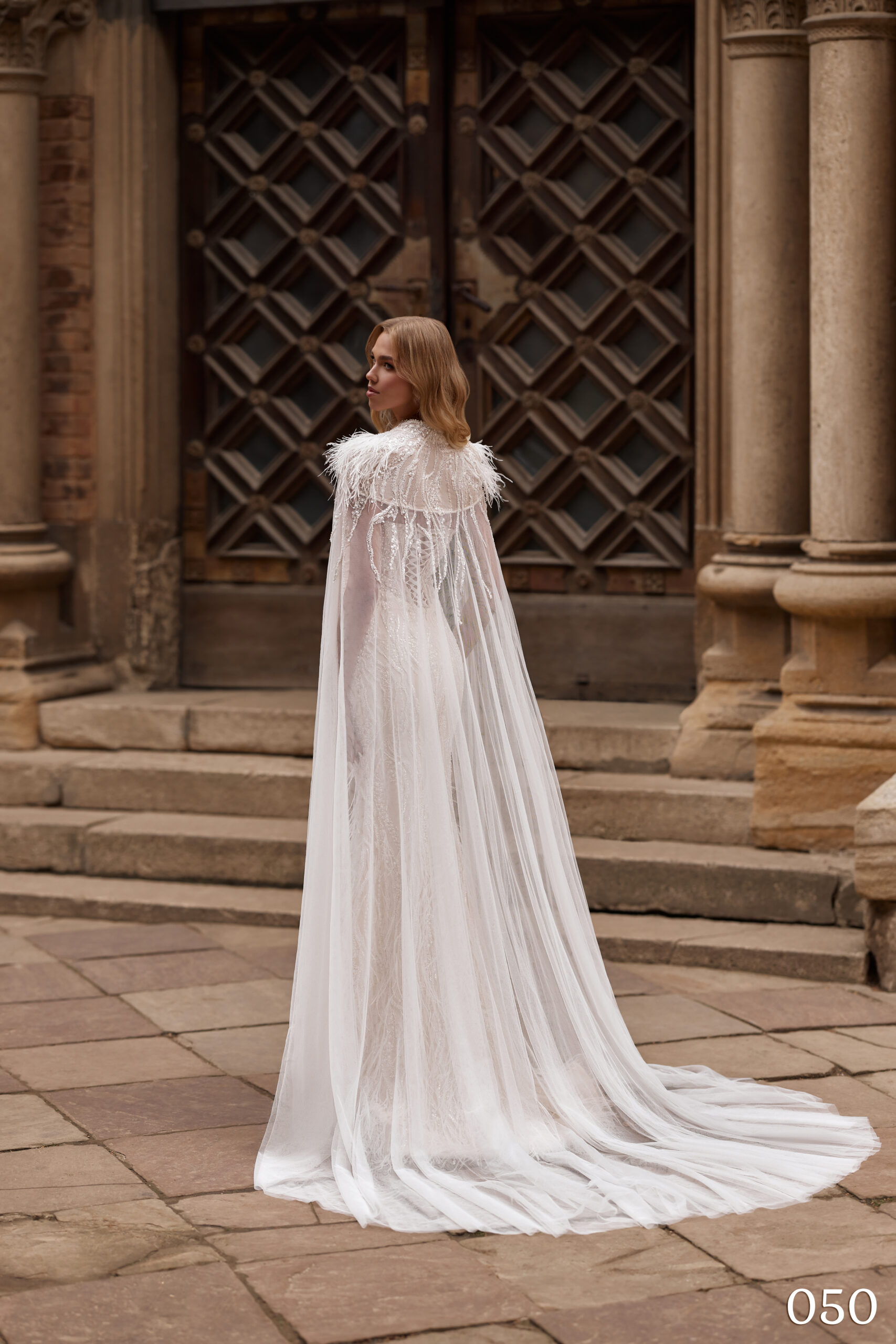 Capă detașabilă cu guler imperial – Această piesă deosebită transformă rochia într-o creație de vis. Realizată din dantelă fină, la nivelul umerilor, creează un efect de continuitate cu rochia, acoperind golurile senzuale ale designului sirenă. Tunica înaltă, decorată cu pene fluide, se închide în față, oferind un aer misterios și regal. Capă continuă cu o trenă lungă, ce curge grațios pe sol, oferind o apariție impunătoare.
